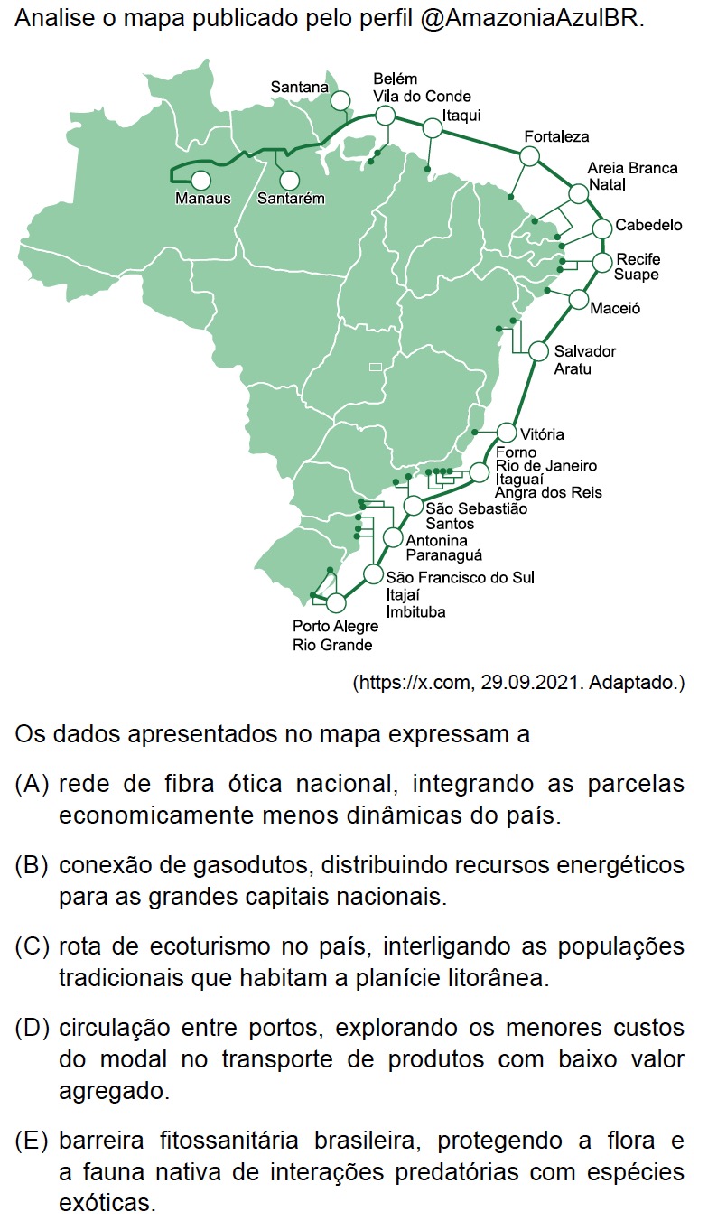 O mapa destaca as principais regiões portuárias do Brasil, mostrando que existe uma ligação entre estes portos. Os navios são excelentes opções para o transporte de mercadorias de baixo valor agregado, como as commodities minerais e agrícolas, por conseguirem transportar um grande volume de produtos simultaneamente, aspecto importante já que o lucro da comercialização das commodities cresce quando a venda é feita em grandes quantidades.
