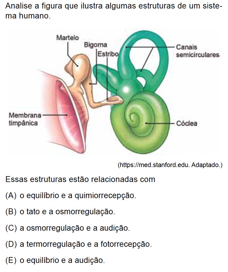 Os canais semicirculares estão relacionados com o equilíbrio corporal. Membrana timpânica, martelo, bigorna, estribo e cóclea estão relacionados com a audição.