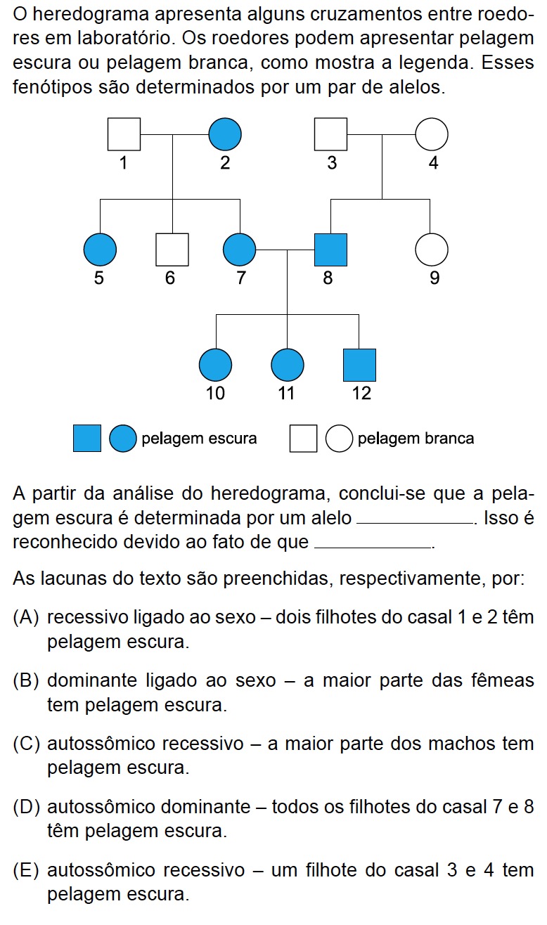 O fato de o casal de pelagem branca 3 e 4 apresentarem filho de pelagem escura indica que pelagem escura é um caráter recessivo e o casal é heterozigoto. Não pode ser um caso de herança recessiva ligada ao sexo, pois a mãe 2 de pelagem escura seria homozigota recessiva e o seu filho 6 deveria apresentar também pelagem escura, pois receberia o gene recessivo dela. A pelagem escura também não é condicionada a um alelo dominante ligado ao sexo, pois o indivíduo 8 teria que receber este gene de sua mãe (indivíduo 4), que não apresenta pelagem escura.