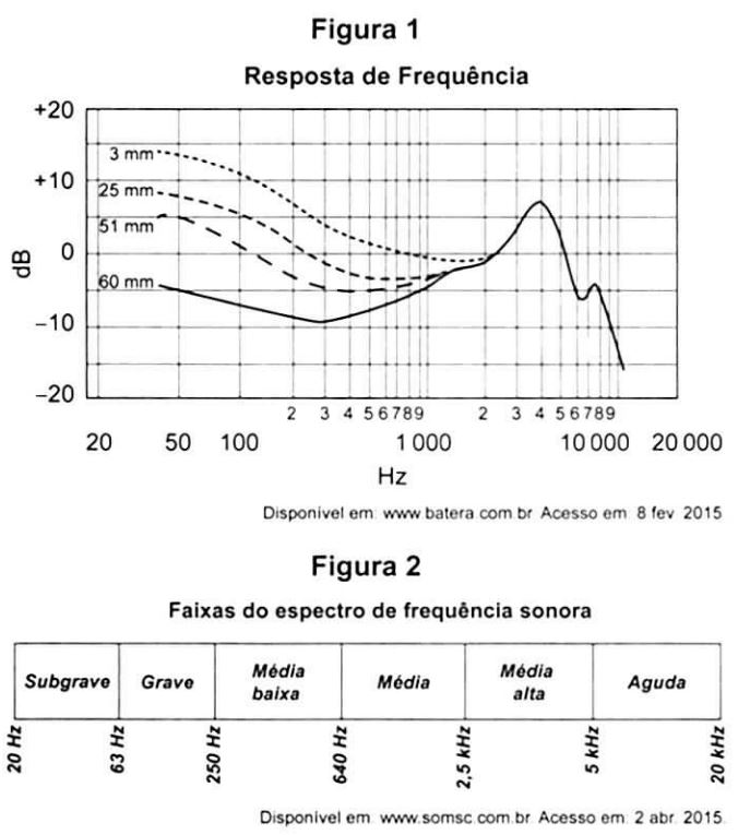 A Figura 1 apresenta o gráfico da intensidade, em decibéis (dB), da onda sonora emitida por um alto-falante, que está em repouso, e medida por um microfone em função da frequência da onda para diferentes distâncias: 3 mm, 25 mm, 51 mm e 60 mm. A Figura 2 apresenta um diagrama com a indicação das diversas faixas do espectro de frequência sonora para o modelo de alto-falante utilizado neste experimento.