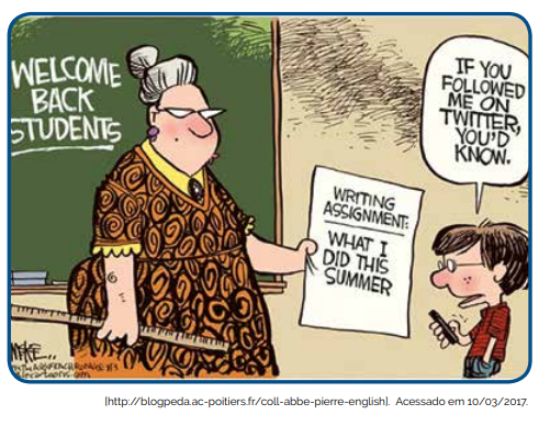 As informações não verbais e verbais da charge permitem concluir que o garoto já havia relatado suas experiências nas férias, via redes sociais, e a professora estaria pedindo um relato, de certa forma, atrasado, mostrando o choque entre as gerações no ambiente escolar.