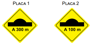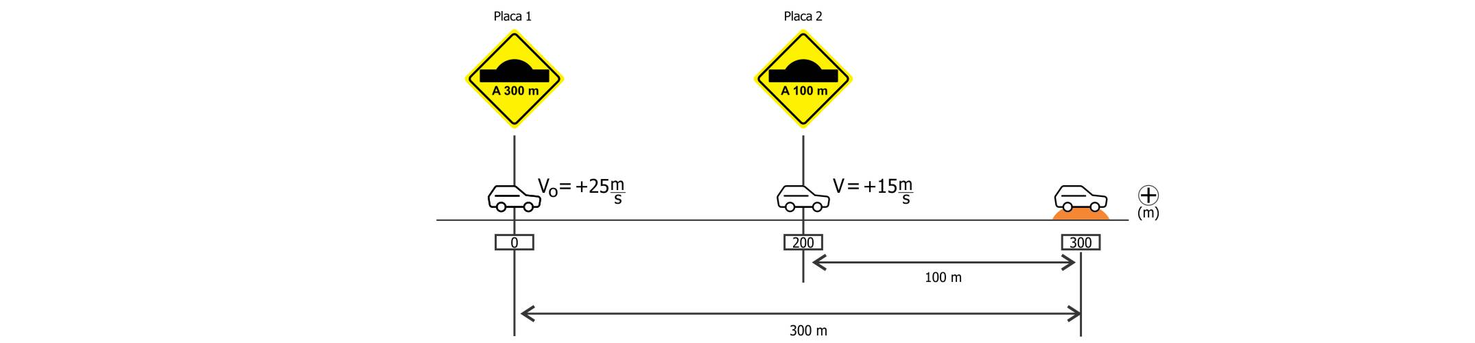 Um motorista dirigia seu automóvel por uma estrada reta. Ao passar pela placa 1, com velocidade de 25 m/s, iniciou a frenagem de seu veículo mantendo uma desaceleração constante até passar pela lombada. Em seu trajeto, passou pela placa 2, com velocidade de 15 m/s.