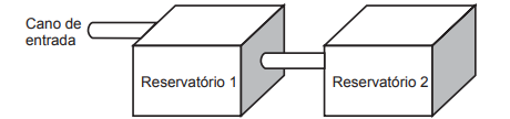 A água entra no sistema pelo cano de entrada no Reservatório 1 a uma vazão constante e, ao atingir o nível do cano de ligação, passa a abastecer o Reservatório 2. Suponha que, inicialmente, os dois reservatórios estejam vazios.