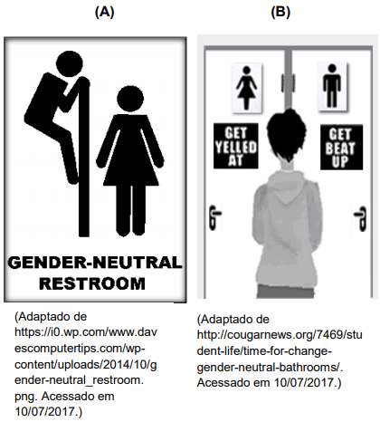 No panfleto (B), abaixo do ícone de gênero feminino, está escrito: “Recebido(a) com gritaria”. E, sob o ícone de gênero masculino, aparece “Risco de ser espancado(a)”. Daí, a dúvida que pode acometer as pessoas transgênero. Então, pode-se concluir que o panfleto argumenta a favor de banheiros unissex para evitar o dilema dessas pessoas.