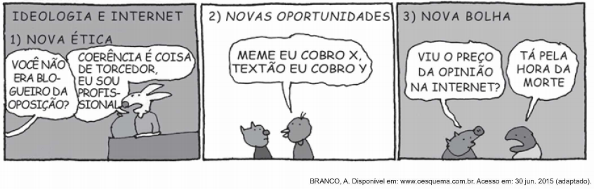 Assim, pode-se afirmar que, de acordo com a tira, as opiniões e os pontos de vista expostas na internet não são reflexo de manifestações sinceras. Pelo contrário, são determinados por interesses.