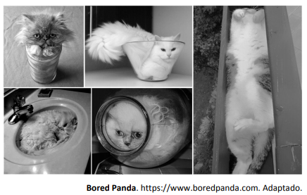 Uma postagem de humor na internet trazia como título “Provas de que gatos são líquidos” e usava, como essas provas, fotos reais de gatos, como as reproduzidas aqui.