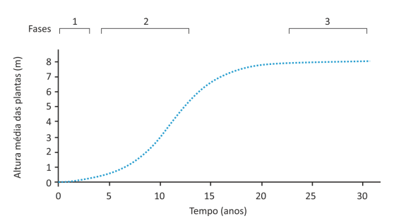 A curva do gráfico mostra a variação da altura média de plantas durante a sucessão primária, em uma área na qual a vegetação nativa, de floresta tropical úmida, foi totalmente destruída pelo derrame de lava de um vulcão. No início da sucessão, o solo era composto por rocha nua (lava consolidada). Na parte superior do gráfico, estão representadas três fases da sucessão (1, 2 e 3).