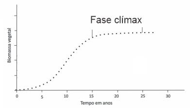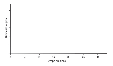 b) No gráfico de sua Folha de Respostas, desenhe uma curva que represente a tendência quanto à biomassa da comunidade vegetal em relação ao tempo decorrido durante essa sucessão, indicando sua fase climáxica.