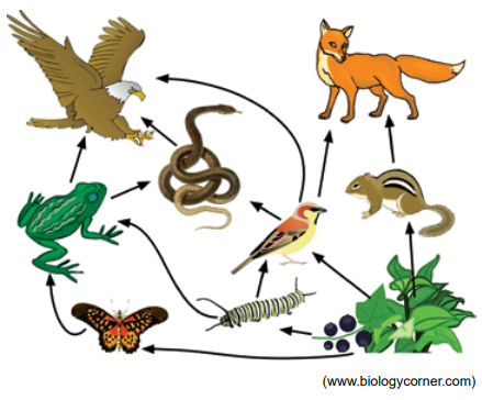 Existem intrincadas teias alimentares nos diversos ecossistemas. Nelas os seres vivos formam uma complexa rede de transferência de energia e matéria, mantendo, na maioria das vezes, um equilíbrio populacional. Analise a teia a seguir.