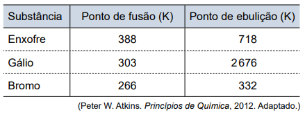 Em um ambiente com a mesma condição de temperatura máxima do deserto de Lut e pressão atmosférica igual a 1 atm, as substâncias enxofre, gálio e bromo apresentam-se, respectivamente, nos estados físicos
