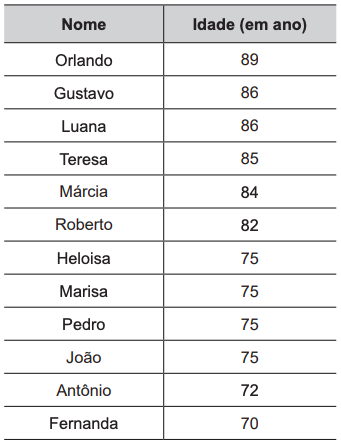 O Estatuto do Idoso, no Brasil, prevê certos direitos às pessoas com idade avançada, concedendo a estas, entre outros benefícios, a restituição de imposto de renda antes dos demais contribuintes. A tabela informa os nomes e as idades de 12 idosos que aguardam suas restituições de imposto de renda. Considere que, entre os idosos, a restituição seja concedida em ordem decrescente de idade e que, em subgrupos de pessoas com a mesma idade, a ordem seja decidida por sorteio.