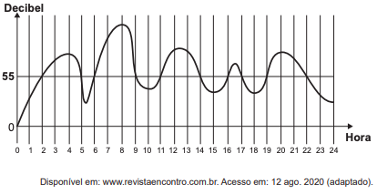 A exposição a barulhos excessivos, como os que percebemos em geral em trânsitos intensos, casas noturnas e espetáculos musicais, podem provocar insônia, estresse, infarto, perda de audição, entre outras enfermidades. De acordo com a Organização Mundial da Saúde, todo e qualquer som que ultrapasse os 55 decibéis (unidade de intensidade do som) já pode ser considerado nocivo para a saúde. O gráfico foi elaborado a partir da medição do ruído produzido, durante um dia, em um canteiro de obras.