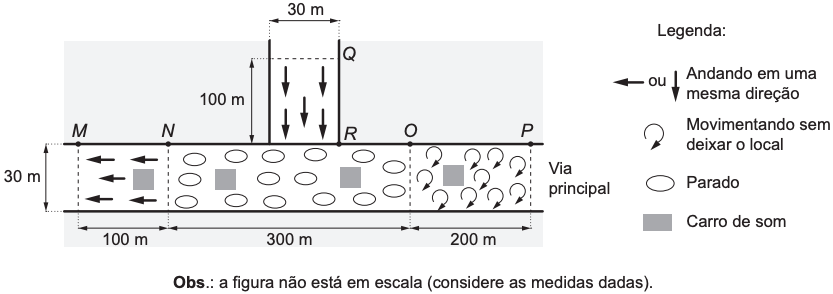 - o trecho NO corresponde a um retângulo de área 300 ⋅ 30 = 9000 m². Como, nesse trecho, as pessoas estão paradas, deve ser considerada a densidade de 6 pessoas por metro quadrado, o que totalizaria 9000 ⋅ 6 = 54 000 pessoas.