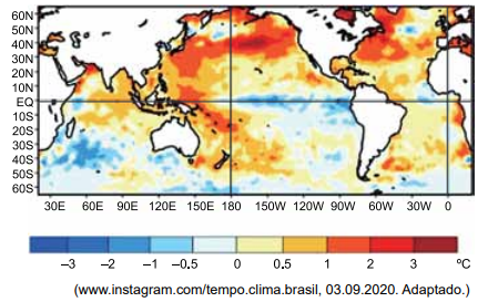 Observa-se no mapa que, dentre as anomalias climáticas registradas durante agosto de 2020, a área central do oceano Pacífico apresenta baixas médias térmicas, fato associado ao fenômeno La Niña.