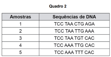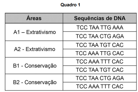 Considere um banco de dados (Quadro 1) que apresenta sequências hipotéticas de DNA de duas áreas de extrativismo permitido (A1 e A2) e duas áreas de conservação (B1 e B2). Um órgão de fiscalização ambiental recebeu uma denúncia anônima de que cinco lojas moveleiras (1, 2, 3, 4 e 5) estariam comercializando produtos fabricados com madeira oriunda de áreas onde a extração é proibida. As sequências de DNA das amostras dos lotes apreendidos nas lojas moveleiras foram determinadas (Quadro 2).