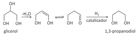 Na produção de biodiesel, o glicerol é formado como subproduto. O aproveitamento do glicerol vem sendo estudado, visando à obtenção de outras substâncias. O 1,3-propanodiol, empregado na síntese de certos polímeros, é uma dessas substâncias que pode ser obtida a partir do glicerol. O esquema a seguir ilustra o processo de obtenção do 1,3-propanodiol.