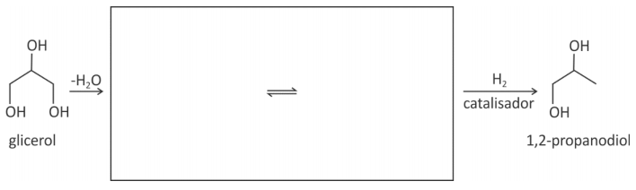 a) Na produção do 1,3-propanodiol a partir do glicerol, também pode ocorrer a formação do 1,2-propanodiol. Na imagem abaixo, complete o esquema que representa a formação do 1,2-propanodiol a partir do glicerol.