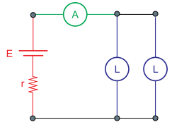 Um estudante tinha disponíveis um gerador elétrico de força eletromotriz E = 50 V e resistência interna r = 2 Ω, duas lâmpadas iguais com valores nominais (60 V – 100 W) e um amperímetro ideal, como representado na figura.
