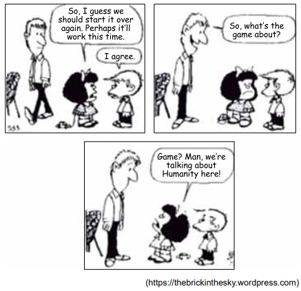 O pai de Mafalda não entendeu o contexto da conversa, que versava sobre o fim da humanidade, e não sobre o fim de um jogo (game).