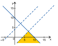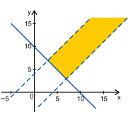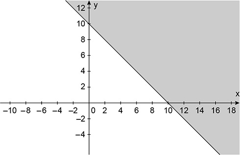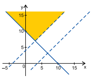 Da primeira desigualdade, temos y ≥ -x + 10, cujas soluções estão representadas a seguir: