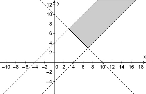 A soma de dois números reais x e y é maior ou igual a 10. A diferença entre eles, em qualquer ordem, é menor do que 4. A representação do conjunto solução dessas desigualdades no plano cartesiano de eixos ortogonais é: