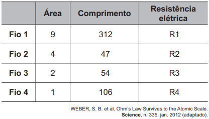 Cientistas da Universidade de New South Wales, na Austrália, demonstraram em 2012 que a Lei de Ohm é válida mesmo para fios finíssimos, cuja área da seção reta compreende alguns poucos átomos. A tabela apresenta as áreas e comprimentos de alguns dos fios construídos (respectivamente com as mesmas unidades de medida). Considere que a resistividade mantém-se constante para todas as geometrias (uma aproximação confirmada pelo estudo).