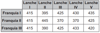 Uma rede de hamburgueria tem três franquias em cidades distintas. Visando incluir um novo tipo de lanche no cardápio, o gerente de marketing da rede sugeriu que fossem colocados à venda cinco novos tipos de lanche, em edições especiais. Os lanches foram oferecidos pelo mesmo período de tempo em todos os franqueados. O tipo que apresentasse a maior média por franquia seria incluído definitivamente no cardápio. Terminado o período de experiência, a gerência recebeu um relatório descrevendo as quantidades vendidas, em unidade, de cada um dos cinco tipos de lanche nas três franquias.