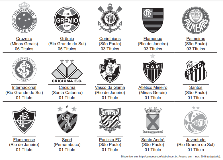 A Copa do Brasil teve, até a edição de 2018, 15 times diferentes como campeões da competição, conforme apresentado na imagem. Suponha que, como homenagem aos times campeões, a Confederação Brasileira de Futebol (CBF) pretenda colocar um painel na sua sede. Esse painel teria 6 linhas e, em cada uma delas, 5 placas, referentes a cada edição da competição, com o nome do time vencedor, o brasão e o ano do título. O painel deve ser fabricado de modo que a primeira linha só tenha clubes gaúchos (Internacional, Grêmio e Juventude); a segunda, apenas times cariocas (Flamengo, Vasco e Fluminense); a terceira, somente times mineiros (Cruzeiro e Atlético Mineiro); a quarta, exclusivamente clubes paulistas (Corinthians, Palmeiras, Santos, Paulista FC, Santo André), e as duas últimas sem nenhuma restrição.